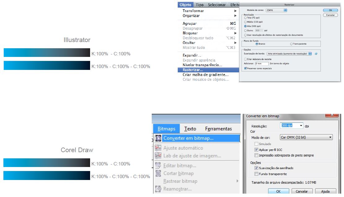 Para que o efeito degradê (fountain fill) para o preto seja natural, é necessário calçá-lo com a cor do degradê, ou as cores intermediárias poderão parecer desbotadas. Ex.: K:100% para C:100% fica desbotado, mas calçando K:100% e C:100% para C:100% o degradê fica melhor. Isto se aplica para as outras cores básicas. Não se esqueça de converter os objetos que contenham degradês para bitmap, evitando problemas de impressão.