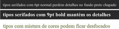 Para uma boa visualização de texto nos fundos chapados, utilize 40% de contraste, ou seja, para o fundo de 100%K a fonte deverá ter 60%K ou menos. Se o fundo for vermelho, M:100% e Y:100%, utilize M:60% e Y:60% para o texto. Se o contraste for menor que 40% o texto poderá ficar ilegível.